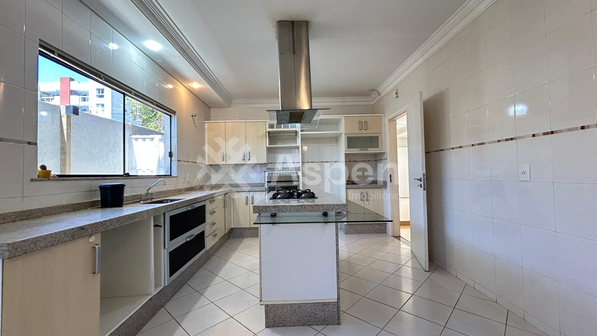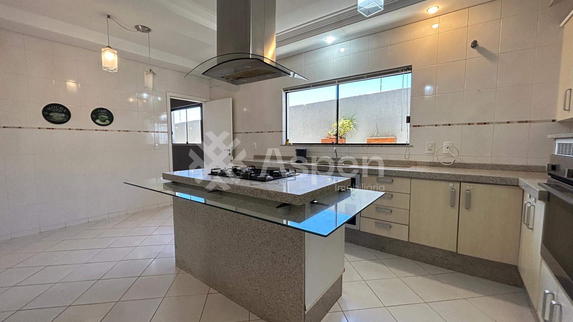 - Uma cozinha com ilha e móveis planejados